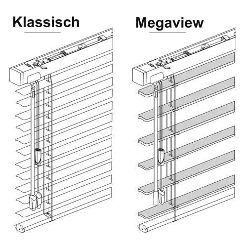 Doppelte Durchsicht: Die innovative MegaView™-Technologie sorgt für eine besonders breite Sicht nach außen – zwei Lamellen öffnen sich gleichzeitig und bieten so fast doppelte Transparenz gegenüber Standardjalousien.